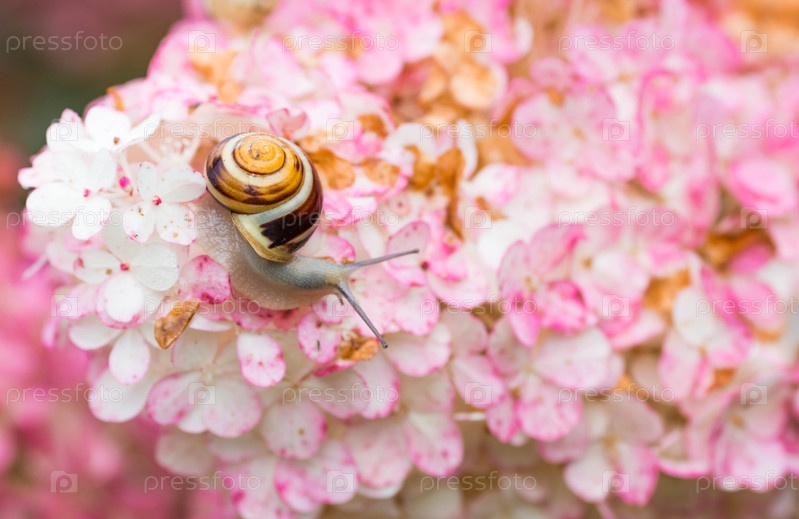 Садовый вредитель. Наземный моллюск-гастропод семейства Helicidae. Лосось виноградная (Helix pomatia) на цветущей гортензии. Съедобная лососевая улитка