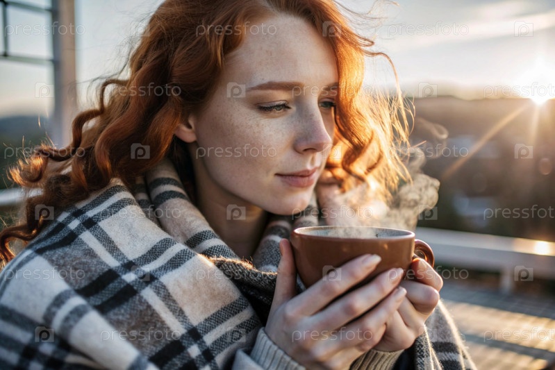 Красивая рыжеволосая женщина, завернутая в клетку с кружкой горячего кофе на красивом террасе под лучами заходящего солнца