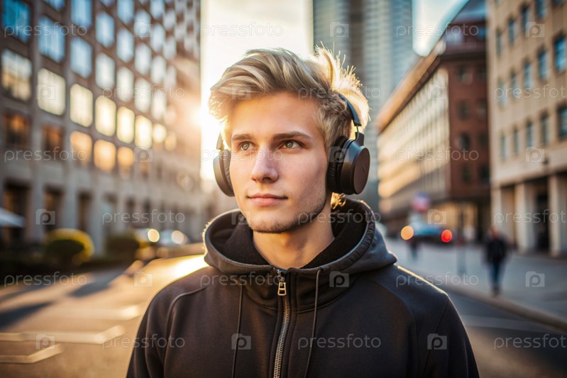 Музыкальный любитель. молодой красавчик в черной толстовке слушает музыку с наушниками на вечерней улице города при закате солнца. мир, гармония, отдых и расслабление
