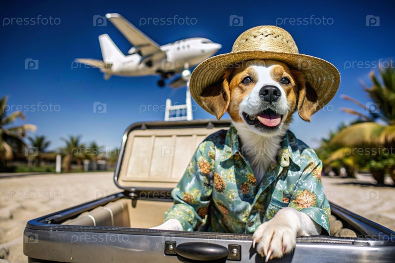 Стильный щенок в путешествии, очаровательная забавная собака в гавайской рубашке и шляпе, сидящая в открытом чемодане