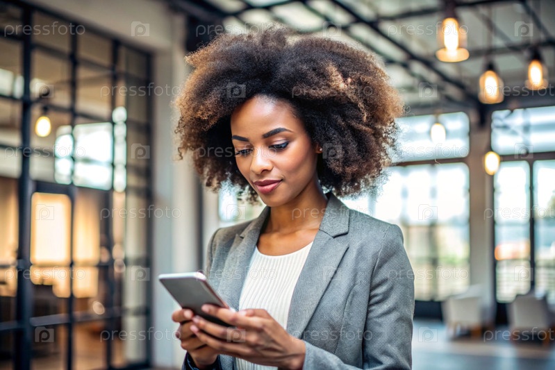 Деловая чернокожая афроамериканка с кудрявыми волосами. Она одета в простую куртку. В руках смартфон. Бизнесмен смотрит на свой мобильный телефон