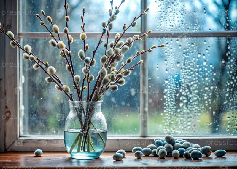Большой план букета ивы в стеклянной вазе на фоне старого белого окна с капельками дождя на стекле