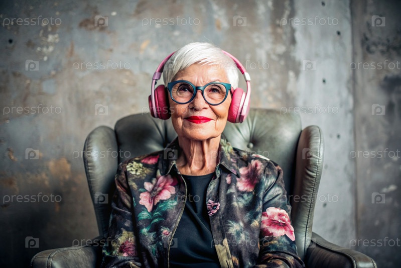 Стильная, современная, счастливая 60-70-летняя женщина слушает музыку в больших беспроводных наушниках дома, на стуле в гостиной