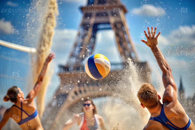 Момент, когда волейбол падает на песок, фиксируется в концепции летних олимпийских видов спорта среди размытой Эйфелевой башни