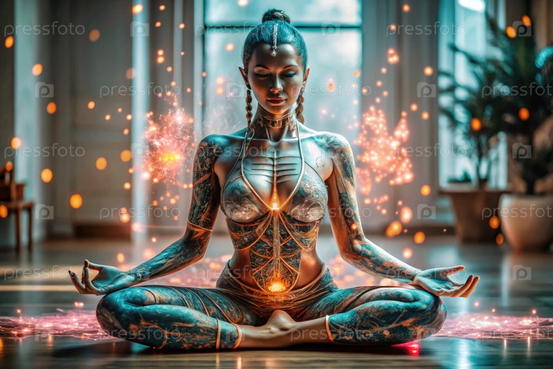 Концепция эзотерической духовной медитации, женщина в позе лотоса.Человеческая медитация, духовность и активация чакр, мистический дух