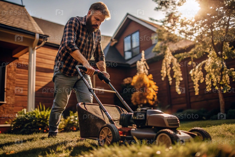 Человек в квадратной рубашке с газонокосилкой стрижет траву на заднем дворе. сельскохозяйственное оборудование для содержания сада. концепция садоводства и деревенской жизни