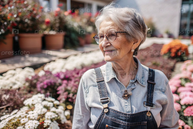 Пожилой садовник с седыми волосами в комбинезоне в уютной цветочной теплице
