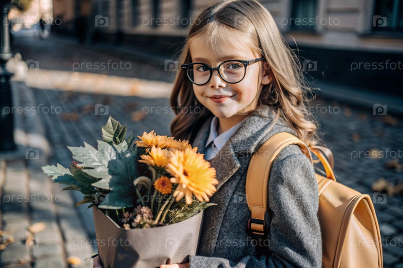 Красивая девушка с очками и букетом осенних цветов впервые идет в школу. Ребенок со школьной сумкой, книгой и цветами. Малыш на городской улице