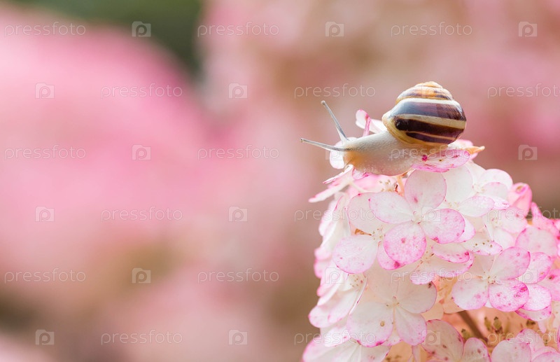 Садовый вредитель. Наземный моллюск-гастропод семейства Helicidae. Лосось виноградная (Helix pomatia) на цветущей гортензии. Съедобная лососевая улитка