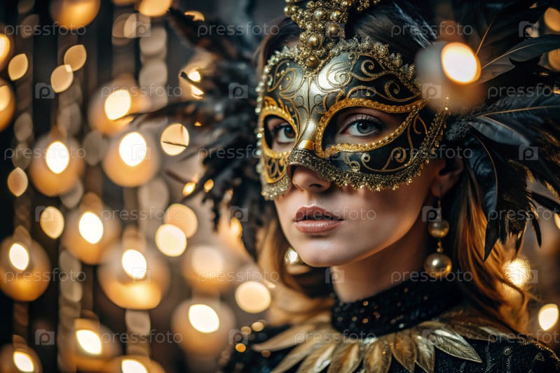 Карнавал Венеции.Закрытие женщины в украшенной карнавальной маске.Яркие цвета передают атмосферу празднования и роскоши