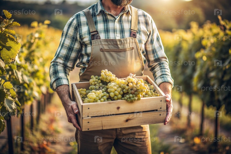 Сельскохозяйственная промышленность. Производство вина. Деревянный ящик с виноградом в руках фермера-мужчины. Садовник собирает богатый урожай. Ближе, солнечный свет. Осенний плодовый сбор