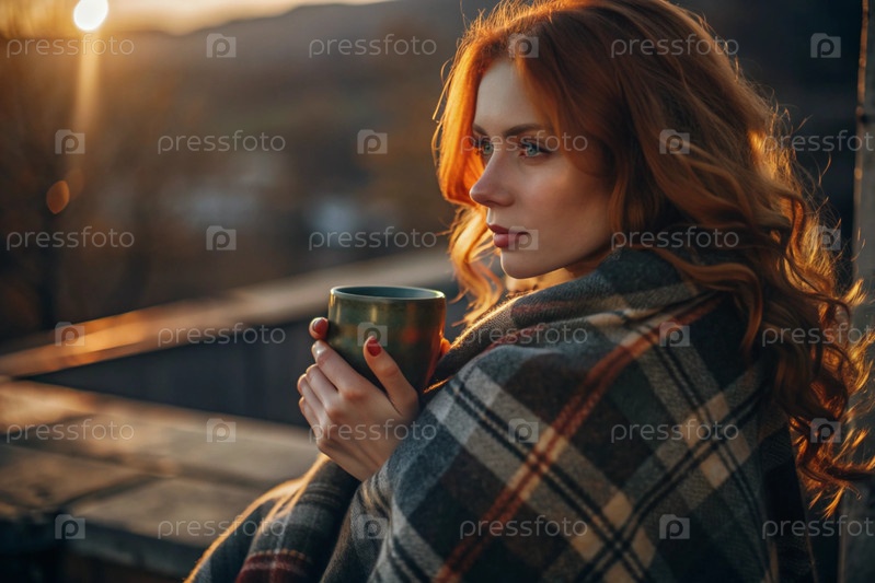 Осенняя ночь. Красивая рыжеволосая женщина, завернутая в клетку с кружкой горячего кофе на красивом террасе под лучами заходящего солнца. Девушка вдыхает аромат напитка. Романтика, комфорт и гармония
