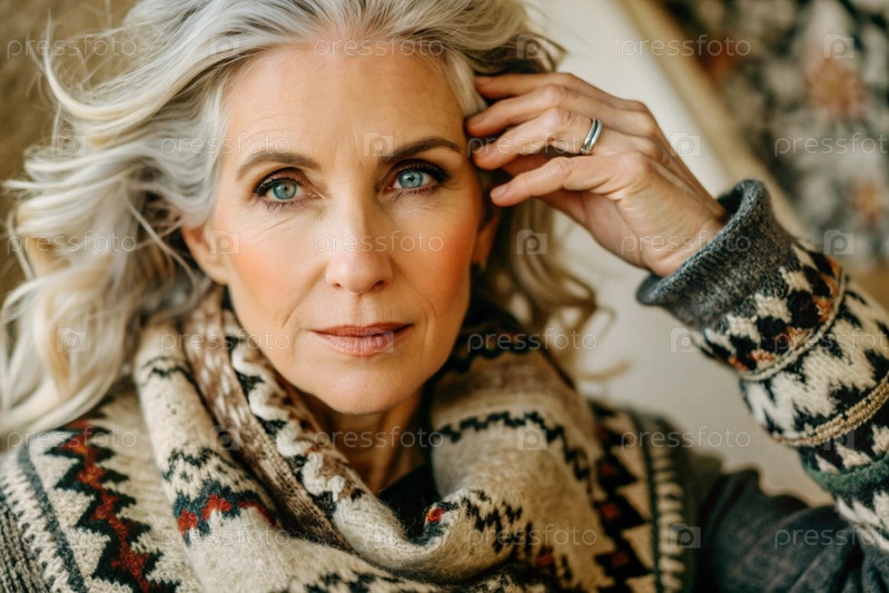 Осенний портрет красивой пожилой женщины, пенсионерки 70 лет. Она носит шарф с этническим узором и теплый свитер. Концепция жизни пожилых людей