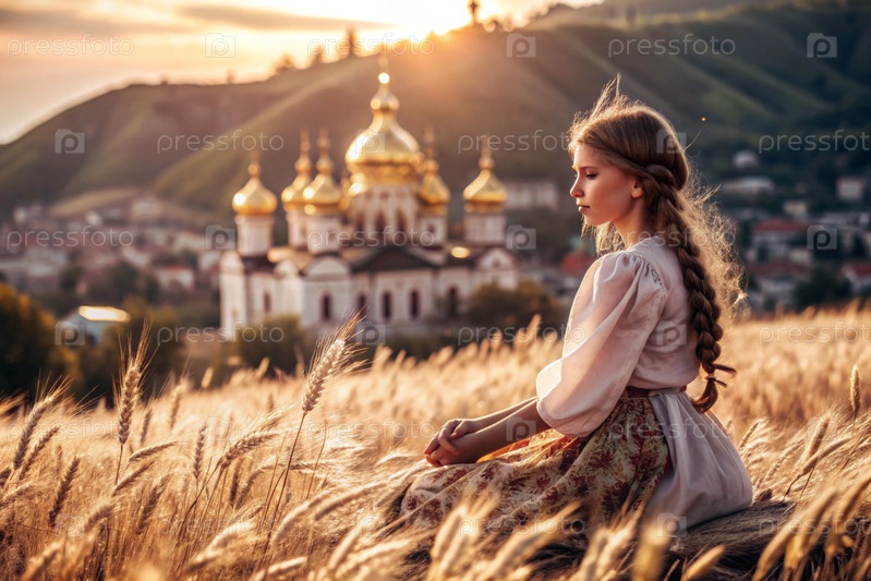Молодая девушка в льняном платье на фоне поля спелых золотых пшениц и православной церкви при закате солнца