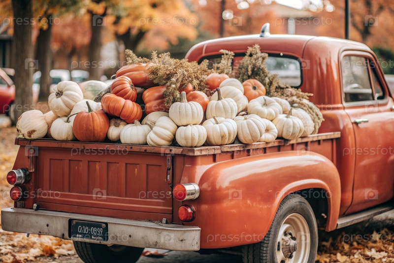 Осень, осенний дизайн.Большой урожай тыквы на заднем сиденье ретро-пикапа, крупный план