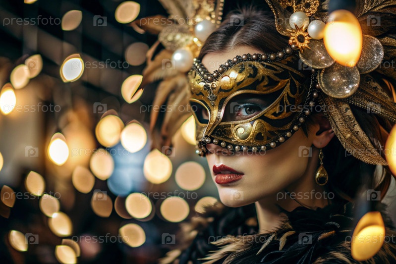 Карнавал Венеции.Закрытие женщины в украшенной карнавальной маске.Яркие цвета передают атмосферу празднования и роскоши