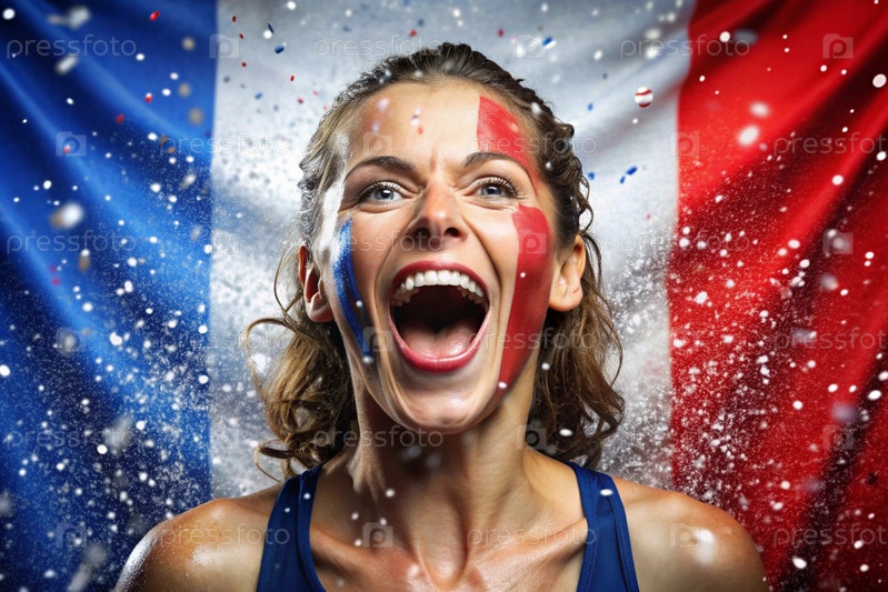 Красивая спортсменка или чирлидер из Франции с радостными криками после победы на Олимпийских играх на фоне французского флага