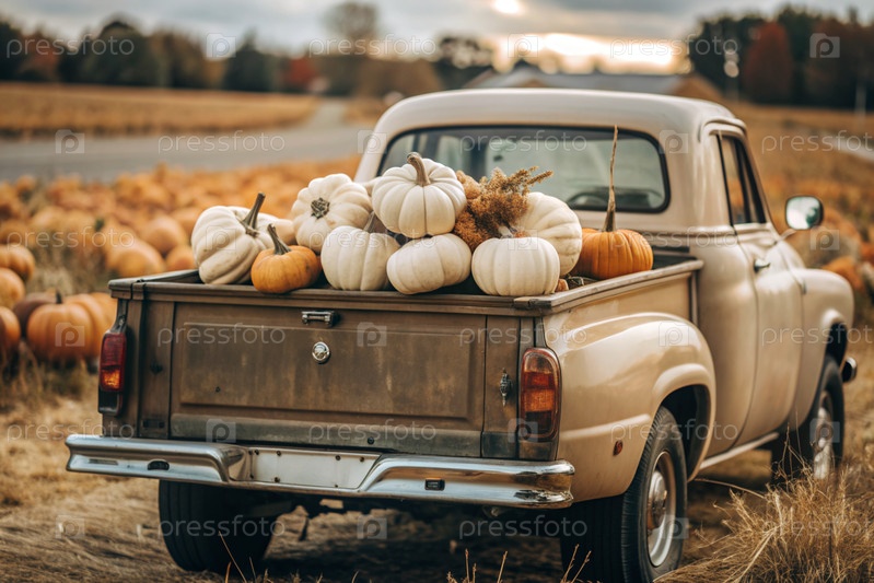 Осень, осенний дизайн.Большой урожай тыквы на заднем сиденье ретро-пикапа, крупный план