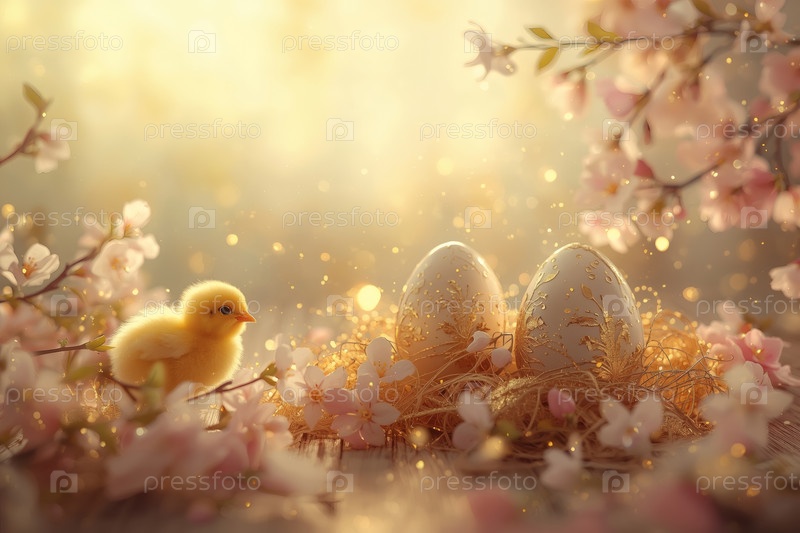 Концепция яркого Пасхального праздника. Нежные розовые пасхальные яйца, желтые курицы и вишневые ветви на деревянном фоне. Концепция ярких пасхальных праздников в 2026 году