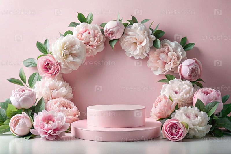 Минималистский розовый пастельный фон для демонстрации продукта.Современный подиум с розовой стеной и розовыми пионками вокруг.Креативный дизайн презентации продукции