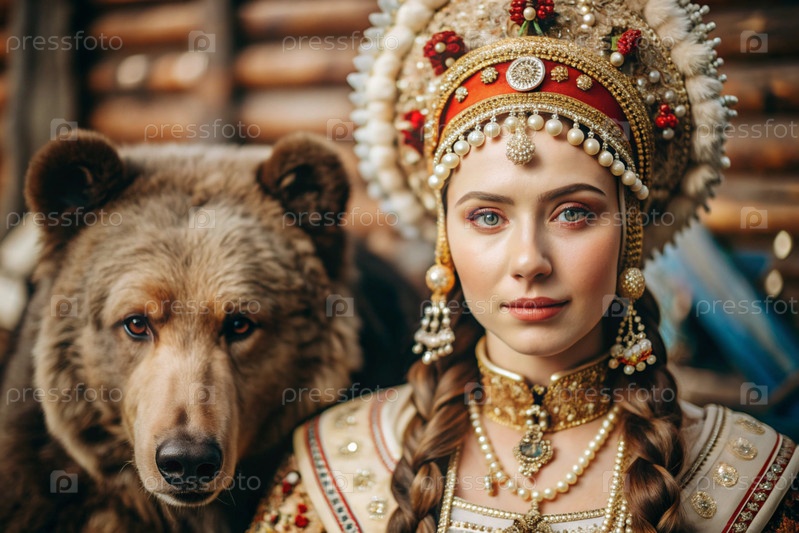 Красивая девушка в традиционном русском национальном костюме.Перед живым медведем.Портрет символизирует традиции и красоту русского народа
