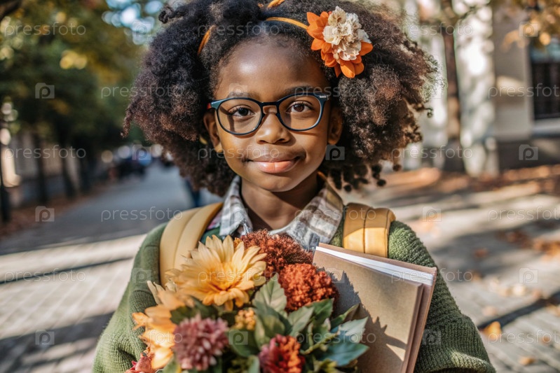 Красивая афроамериканка на очках с букетом осенних цветов впервые идет в школу. Ребенок со школьной сумкой, книгой и цветами. Малыш на городской улице