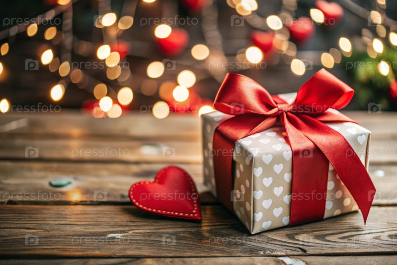Подарочные коробки с огнями и красными сердцами.Уютная концепция на День святого Валентина.Подготовка подарков для близких