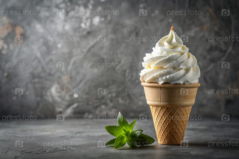 сладкий, холодный десерт. сливочное ванильное мороженое в вафлевой чашке. баннер, реклама. любовь к мороженому
