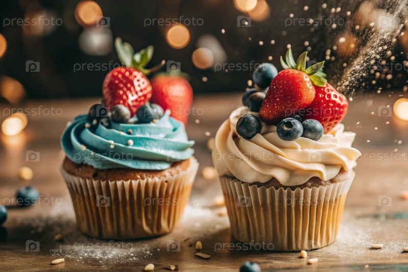 Вкусные красочные кексы со земляницами и чернилами. праздничный кекс, который идеально подходит для веселых торжеств. счастливого дня рождения
