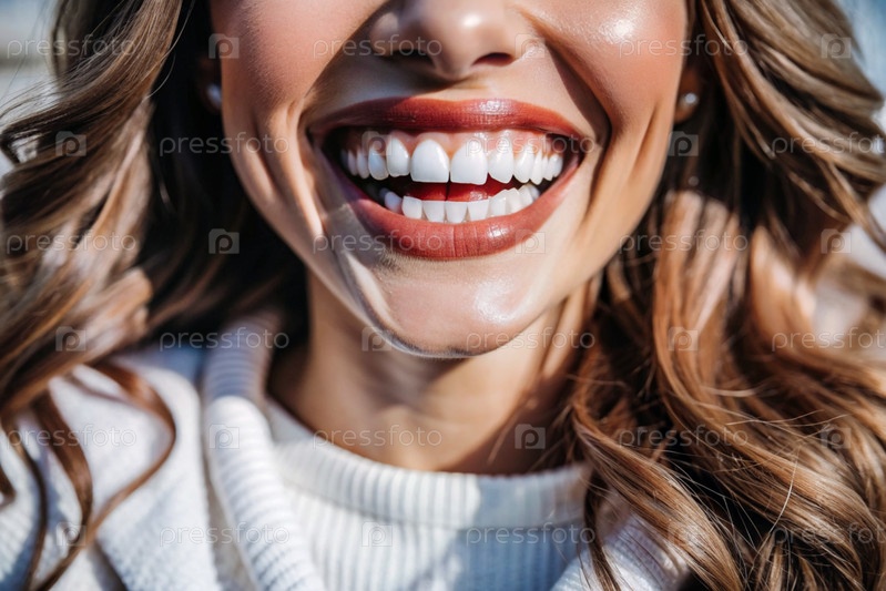 Красивая, очаровательная, белоснежная женская улыбка. Женские зубы до и после отбеливания. Концепция стоматологических клиник