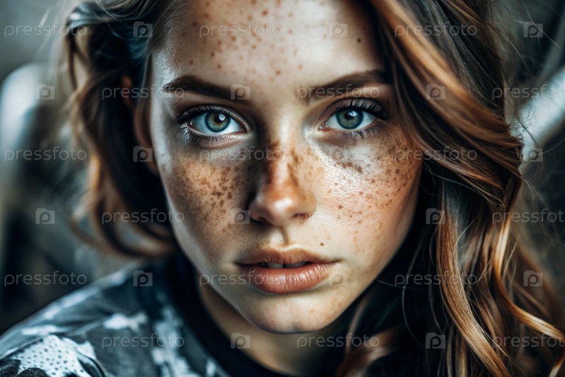 Глубокий эмоциональный портрет. Лицо молодой девушки без макияжа с выразительными глазами и кудрявыми коричневыми волосами. Естественная женская красота