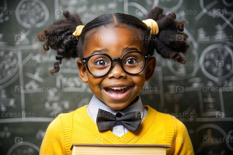 Красивая афроамериканская девушка с очками и книгами. Ребенок впервые ходит в школу. Ребёнок в классе с доской