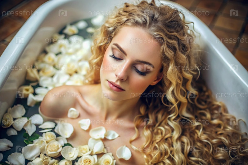 Близкий план красивой блондинки с кудрявыми волосами. она принимает ванну с лепестками роз. на заднем плане интерьер ванной комнаты в стиле лофт