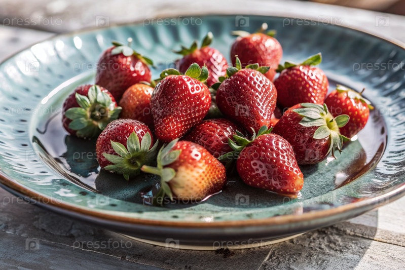 Закрытие свежих клубники. Вкусные ягоды и фрукты ярко-красные с капельками воды. Вегетарианство. Здоровое питание. Свежие плоды на столе