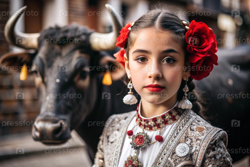 Испанская девушка в традиционном испанском национальном костюме. Перед быком. Бикоборство. Портрет символизирует традиции и культуру народа Испании