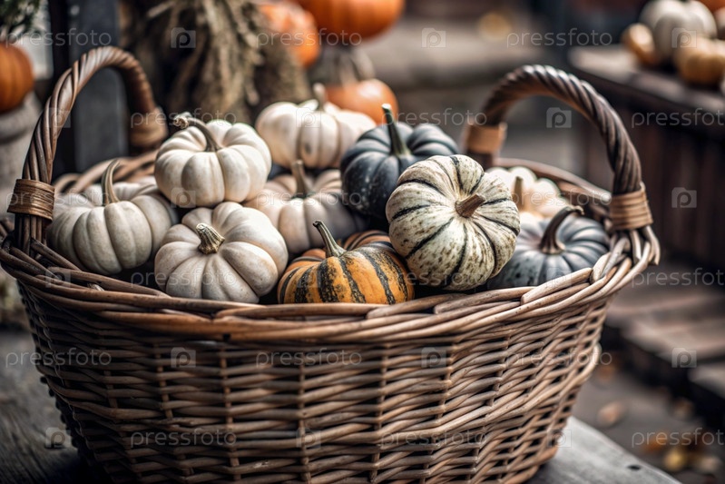 Осенний фон красочные декоративные тыквы в плетеновой корзине богатый урожай концепция Хэллоуина