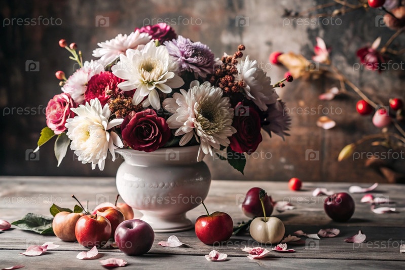 Красочное лето, осенний букет цветов различных красных, розовых, белых оттенков в вазе и спелые красные яблоки на столе