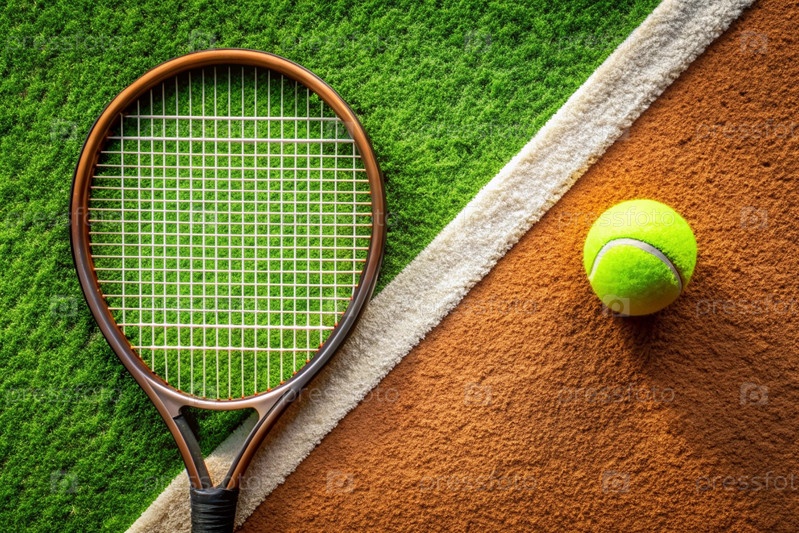 На лужайке жёлтый теннисный мяч и теннисная ракетка, летний вид спорта
