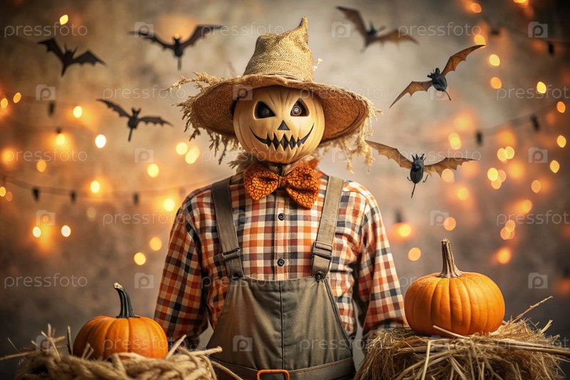 Концепция Хэллоуина. Ужасная. Страх. Устрашающий богий с тыквенной головой, квадратной рубашкой и бабочкой. Баннер, открытка