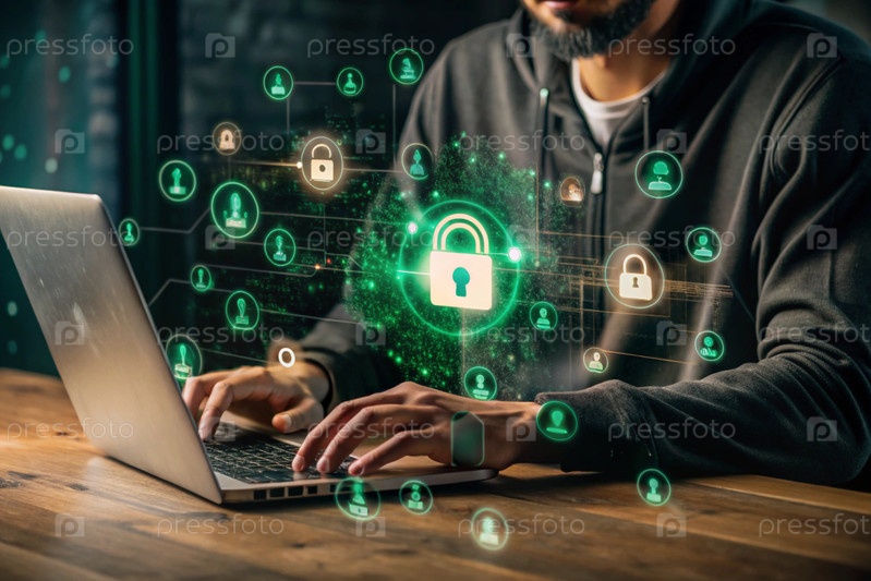 Хакер работает на ноутбуке, цифровые коды на виртуальном фоне. взлом и защита онлайн-данных. цифровые технологии, разработка программного обеспечения