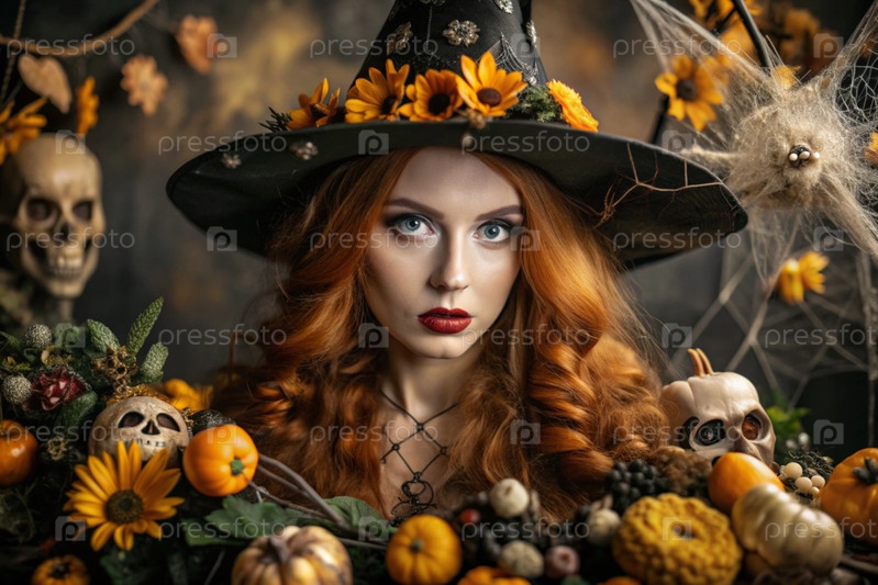 Концепция Хэллоуина. Ужасное. Костюмированная вечеринка. Красивая женщина в костюме ведьмы. Баннер, открытка