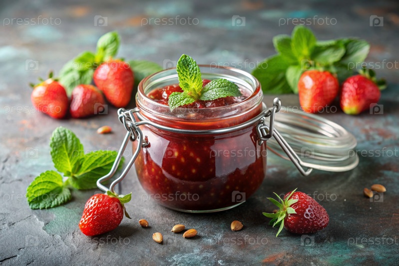 Банка домашней клубники, здоровый варенье с мятой на черном фоне.Сохранение и уборка летом