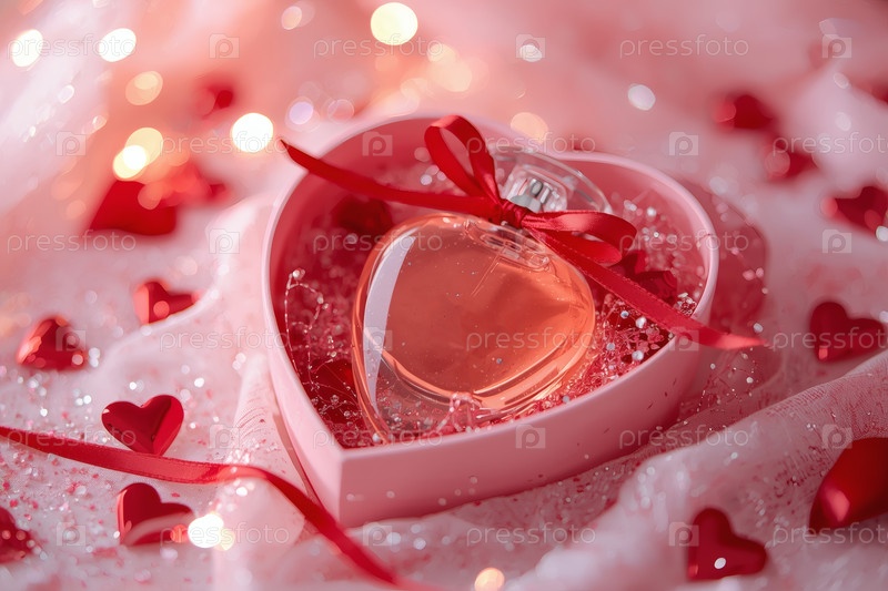 Элегантная бутылка женского парфюма в мягкой розовой подарочной коробке, украшенной красной лентой и сердцами