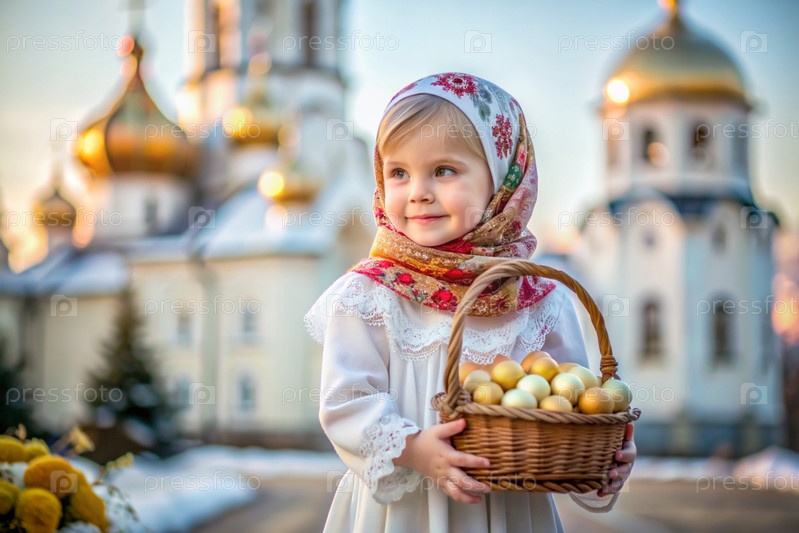 Счастливая Пасха. Христианство. Портрет трехлетней девочки в русском народном платье и шалах с корзиной из плети с пасхальными яйцами в руках на фоне православной церкви