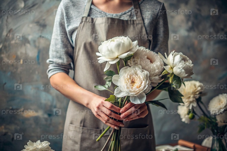Малый бизнес. Декоратор цветочной лавки держит для покупателя красивый деликатный букет пионьев. Цветочный дизайн. Доставка цветов, обработка заказов
