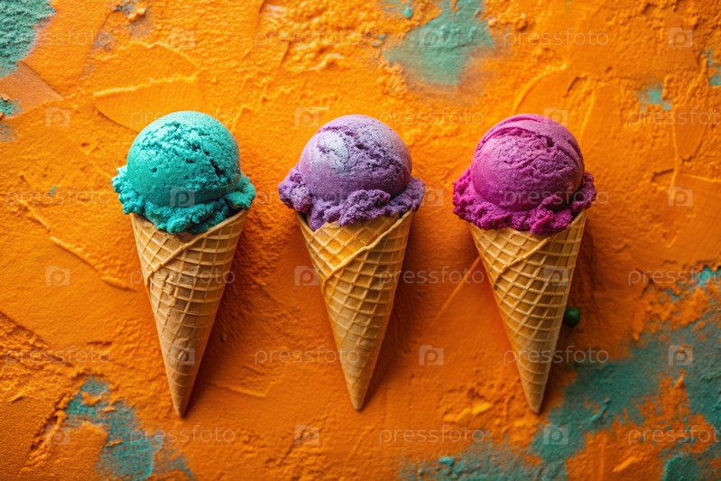 Сладкий десерт. Стильная современная концепция. Туркуазный, фиолетовый, розовый конус мороженого на ярко-оранжевом фоне. Всемирный день мороженого