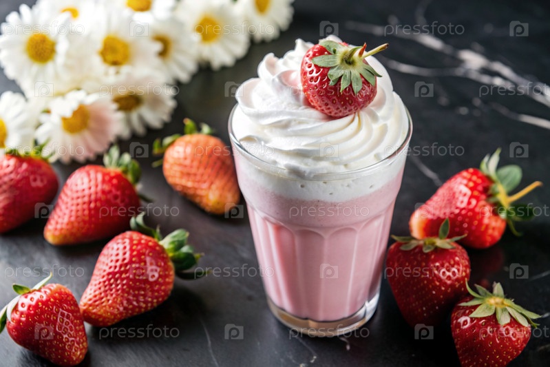 Освежающий клубниковый молочный коктейль с битой сливкой и соломой на столе, окруженном свежими ягодами