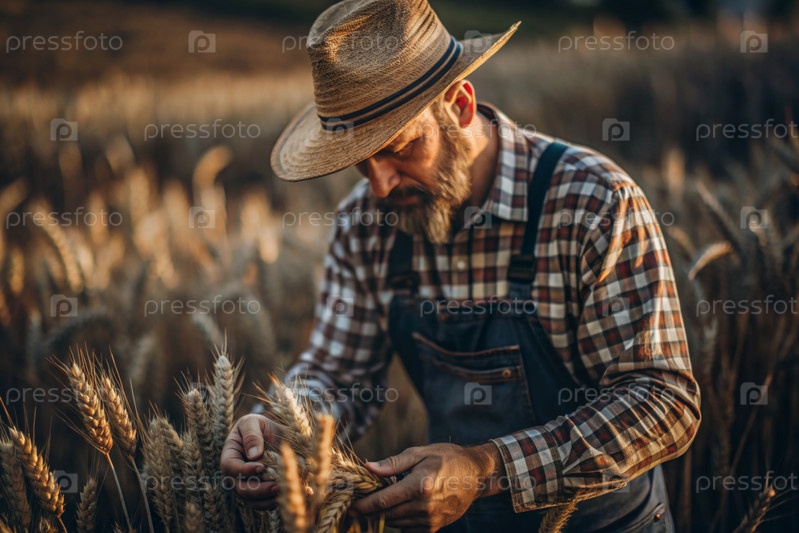 Фермер-мужчина держит золотые колосья пшеницы на фоне созревающего поля. Близкий план фермера. Концепция посадки и сбора богатого урожая. Сельский пейзаж при закате солнца