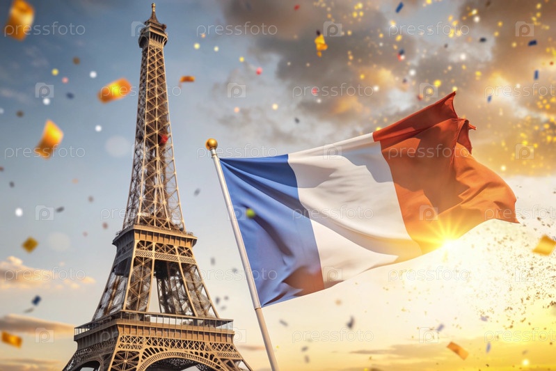 14 июля - Национальный день Франции. Государственный флаг Франции на Эйфелевой башне. Триколор. Концепция Олимпийских игр во Франции 2024