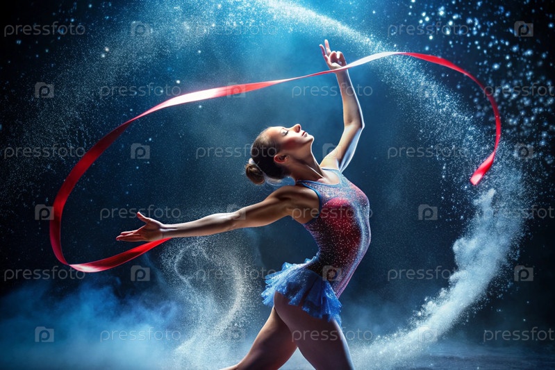 Ритмическая гимнастика - это крупный план красивой гимнастки с лентой в центре внимания на спортивной арене